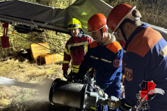 Zuerst benutzten die Jugendlichen unser CAFS, welches wegen einer Routineüberprüfung durch unseren Gerätewart sowieso geleert werden musste. Nachdem jeder einmal mit dem CAFS Löschschaum abgeben durfte, wurde den Jugendlichen noch das Kombischaumrohr und der Schaumaufsatz für ein Hohlstrahlrohr erklärt und sie durften diese auch selber testen. Hierfür gaben wir mit unserem TLF eine geringe Menge Schaummittel ab. Alle Jugendlichen hatten sichtlich Spaß bei der Übung.